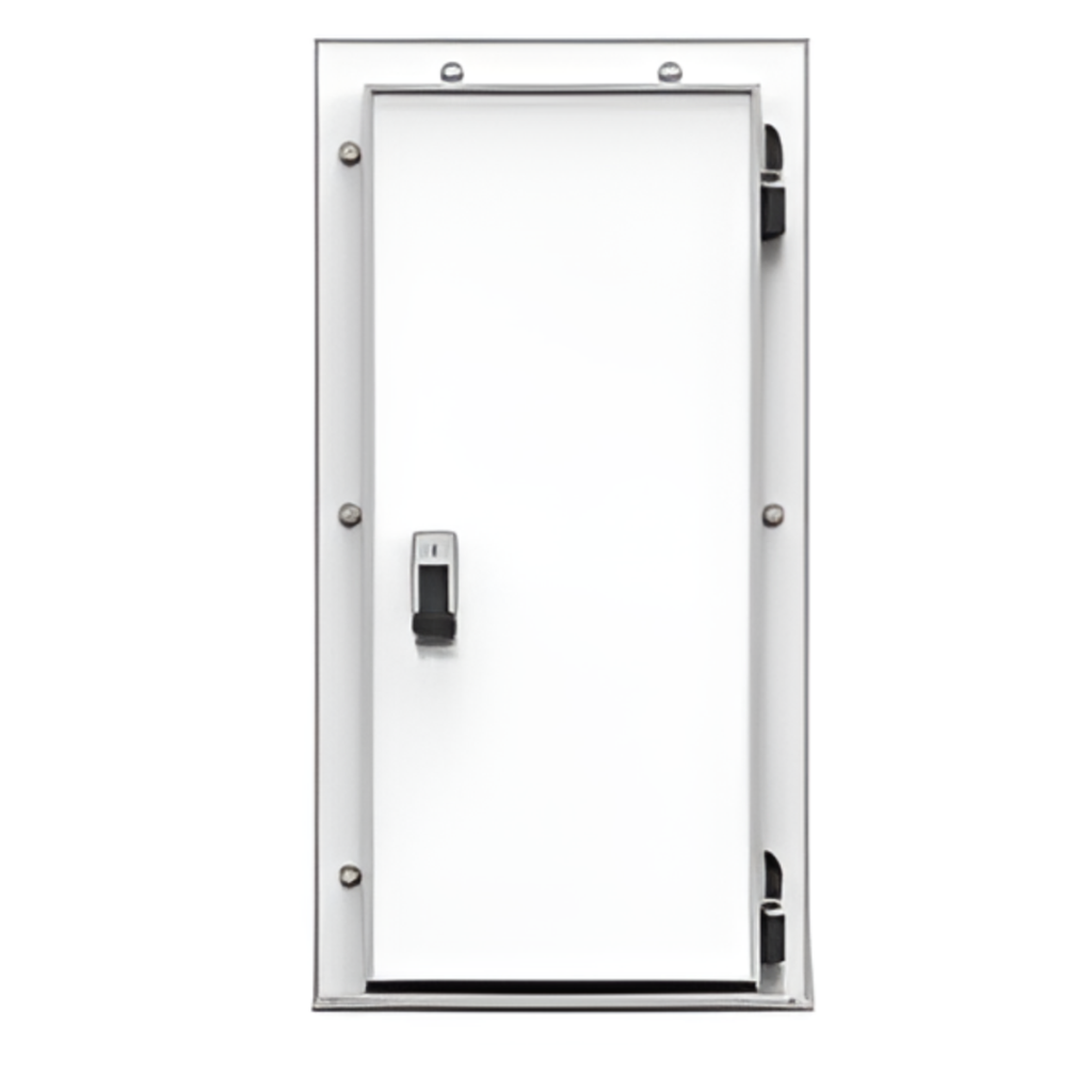 Конструкция: прочная рама из анодированного алюминия устойчива к коррозии, дверное полотно покрыто оцинкованной сталью толщиной 0,45–0,65 мм с полиэфирным слоем (RAL 9003), что обеспечивает долговечность и гигиеничность.