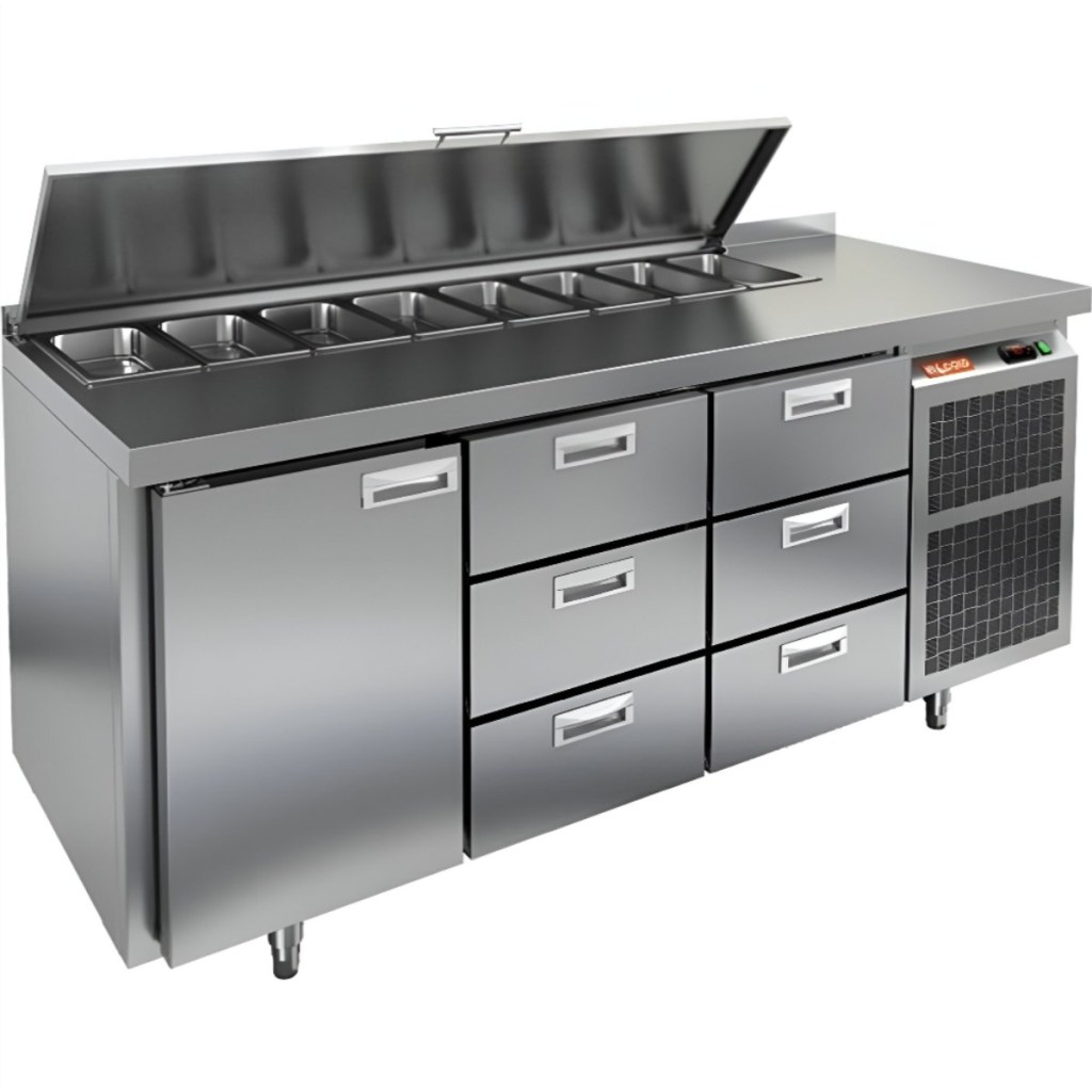 Каталог оборудования Холодильное оборудованиеСтолы охлаждаемыеСтолы холодильные для салатовСтол холодильный для салатов HiCold SL1-133GN (1/3) с крышкой Стол холодильный для салатов HiCold SL1-133GN (1/3) с крышкой Код товара: 064-848 Поделиться: WhatsAppTelegram СравнитьДобавить в КПВ избранное 0 209 962 ₽ В корзину 0 шт Под заказСамовывоз сегодня бесплатно Взять в кредит Купить в лизинг Получить консультацию в WhatsApp Описание Характеристики Отзывы 0 Стол холодильный для салатов HiCold SL1-133GN (1/3) предназначен для использования на предприятиях общественного питания и торговли. Он объединяет рабочую поверхность и охлаждаемый отсек, что делает его удобным решением для хранения, охлаждения и подготовки ингредиентов при приготовлении салатов, пиццы и других блюд. Такая конструкция позволяет повару работать быстрее и эффективнее, так как все необходимые продукты находятся под рукой. Корпус и столешница выполнены из прочной нержавеющей стали, устойчивой к коррозии и легко поддающейся санитарной обработке. Металлическая крышка защищает продукты от загрязнений и сохраняет их свежесть. Особенности модели: Электронная панель управления — точная настройка температурного режима. 1 глухая дверь — удобный доступ к холодильному отсеку. 6 выдвижных ящика — быстрое размещение и замена продуктов. Вместимость салат-бара — до 8 гастроемкостей глубиной до 100 мм. Автоматические доводчики дверей с фиксацией в открытом положении. Легкозаменяемые магнитные уплотнители — надежная герметичность. Открытая агрегатная часть — быстрый доступ для обслуживания. Регулируемые по высоте ножки — устойчивость даже на неровном полу. Толщина столешницы, борта и теплоизоляции — 50 мм, что обеспечивает прочность и энергоэффективность конструкции. HiCold SL1-133GN (1/3) — практичное и удобное решение для профессиональной кухни, обеспечивающее удобную подготовку и хранение ингредиентов. Изображение товара, представленного на фото, может отличаться от его фактического вида. Показать все Габаритные размеры1835×700×850 ммДиапазон рабочей температурыот +2 до +10 °CРасположение агрегатаБоковое Материал столешницыНержавеющая Тип столаС дверьми и ящиками Тип двериГлухая Объём505 лКоличество дверей1 штТип гастроемкостейGN 1/3 Количество ящиков6 штРазмер полки530×325 ммНапряжение220 ВМощность0,46 кВтТип охлажденияДинамическое Тип оттайкиАвтоматическая СтолешницаС бортом Габариты в упаковке2000×850×1000 ммВес нетто130 кгВес брутто185 кгБрендHicold Оставить отзыв Еще никто не оставил отзыв на этот товар Ранее просмотрено Под заказ 320 392 ₽ Стол холодильный для салатов HiCold SL1-2222GN (1/3) с крышкой Под заказ 174 952 ₽ Стол холодильный для салатов HiCold SLE2-111GN (1/6) О З М с крышкой Под заказ 149 302 ₽ Стол холодильный для салатов HiCold SLE2-111GN (1/6) О З без крышки Под заказ 235 161 ₽ Стол холодильный для салатов HiCold SLE1-222GN (1/3) О без крышки Под заказ 107 451 ₽ Стол холодильный для салатов HiCold SLE3-1GN полипропилен, с крышкой Под заказ 140 482 ₽ Стол холодильный для салатов HiCold SL2-11GN (1/6) О без крышки Под заказ 170 901 ₽ Стол холодильный для салатов HiCold SLE3-111GN полипропилен, без крышки