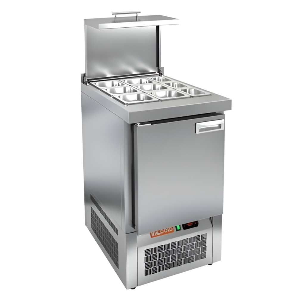 HiCold SLE3-1GN с крышкой — компактный и функциональный салатный стол, который сочетает охлаждение и удобное рабочее пространство. Подходит для профессиональных кухонь, обеспечивая быстрый доступ к ингредиентам и оптимальные условия их хранения.